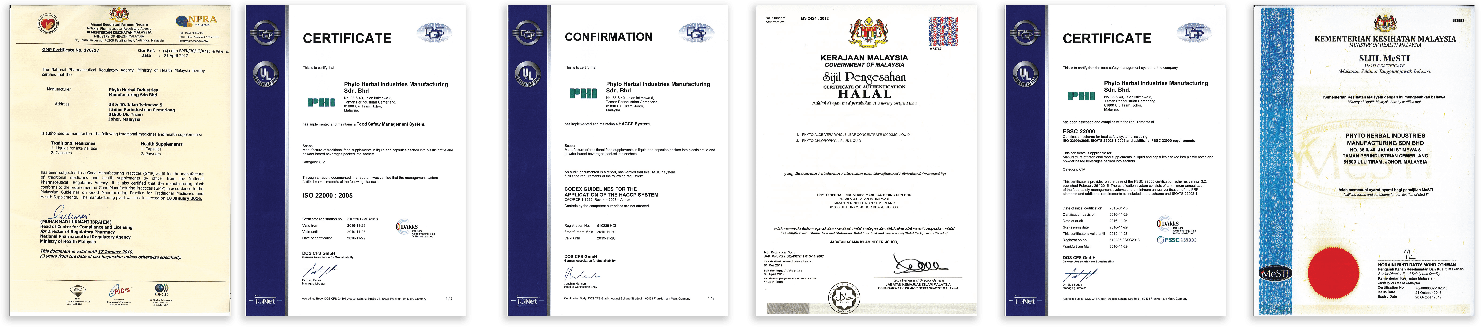 Pabrik PHI telah memiliki standar kualitas internasional. PHI telah disertifikasi oleh Good Manufacturing Practice Standars (GMP) Pharmaceutical Regulatory Agency of Malaysia (NPRA), ISO 22000 Food Safety Management System dan HACCP System serta memperoleh sertifikasi Halal oleh Malaysia Halal Authority (JAKIM).