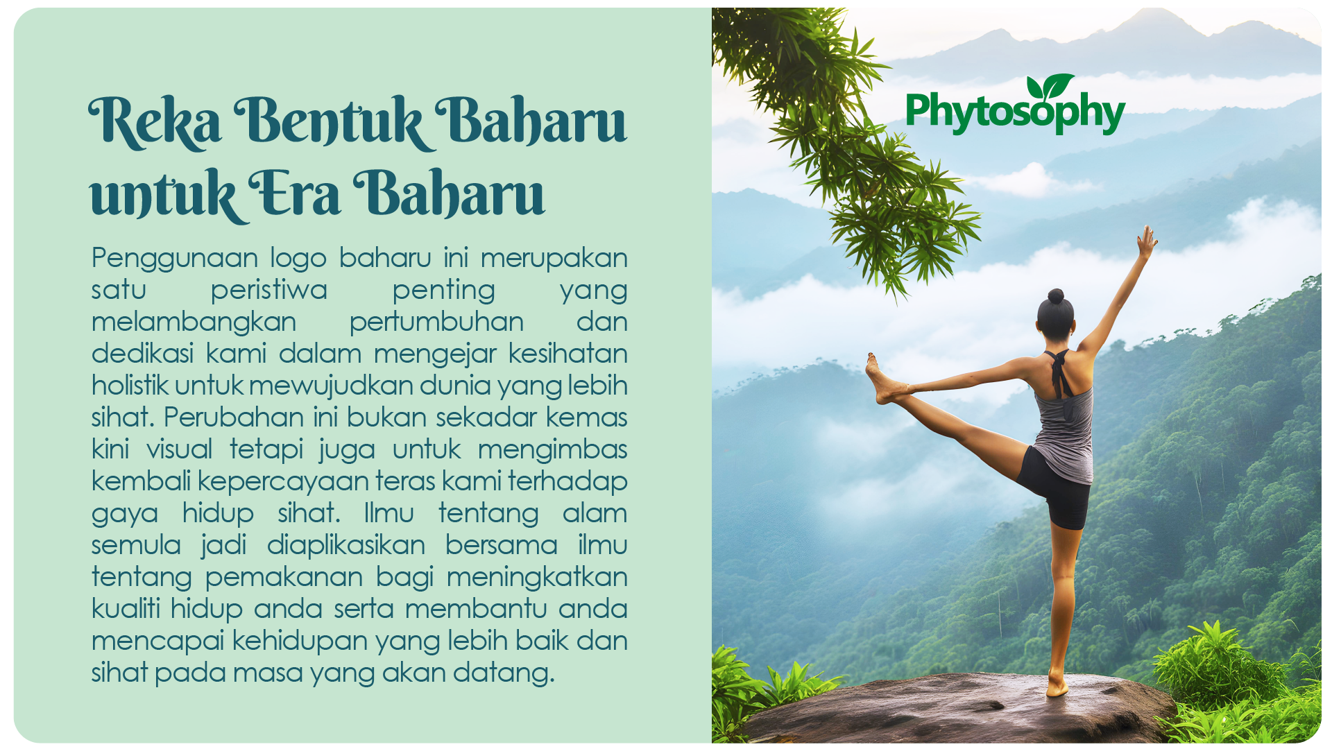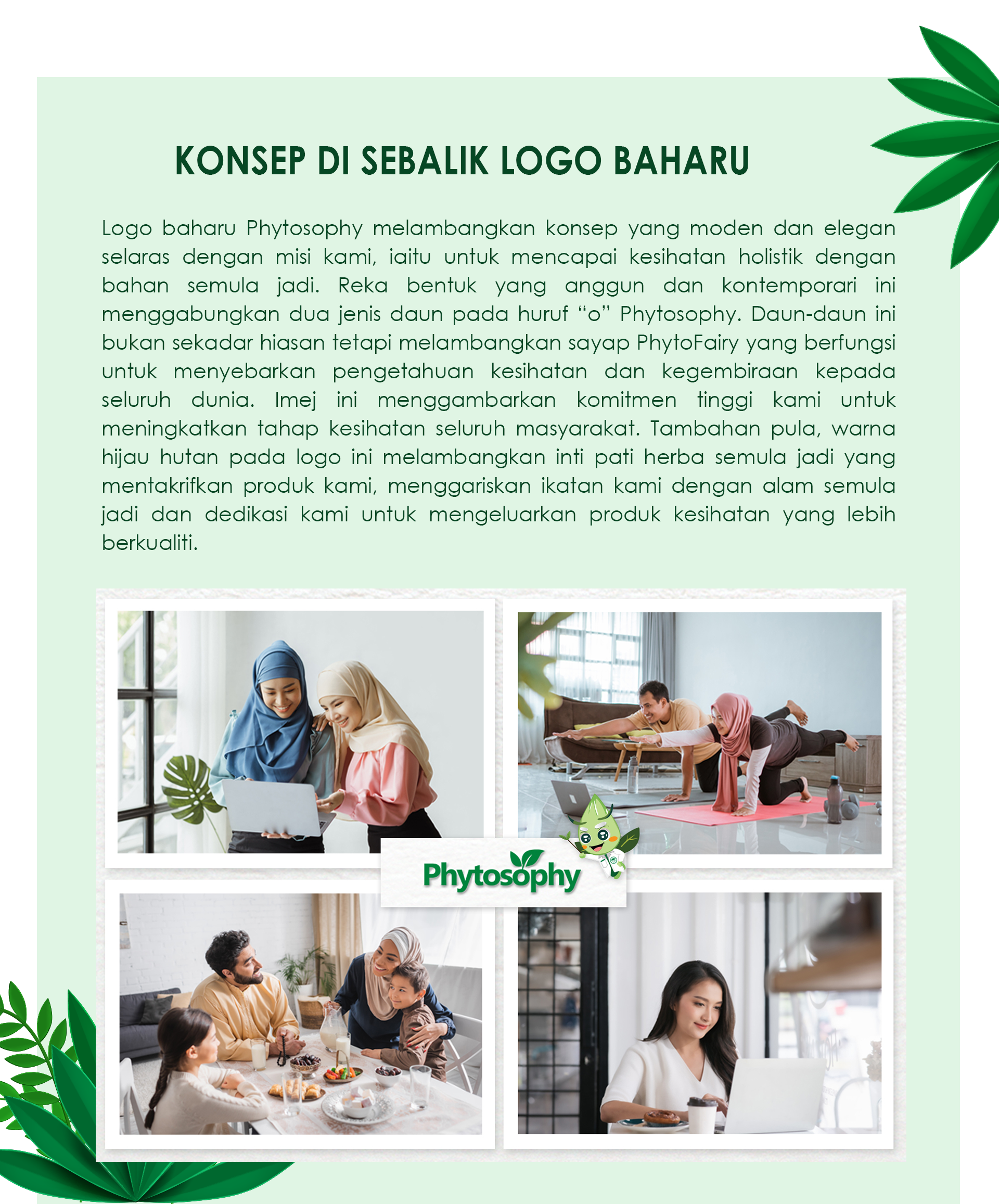 Phytosophy sudah bersedia untuk mengharungi masa depan yang penuh dengan cabaran dan inovasi baharu semasa kami beralih ke identiti visual baharu ini. Logo kami yang baharu ini memainkan peranan sebagai mercu tanda komitmen kami yang berterusan. Ianya dapat memberi jalan penyelesaian yang unggul terhadap kesihatan setiap masyarakat dengan menghasilkan produk menggunakan bahan herba semua jadi yang premium.