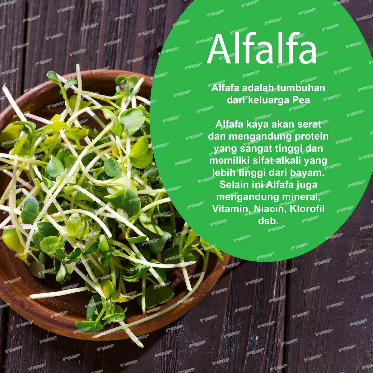 Chlorella, Spirulina, Dunaliella, Salina Algae, Kelp, Barley Grass, Wheat Grass, Green Tea, Apel Fiber, Brown Rice, Soy Lechitin, Alfafa, dan Chicory Root